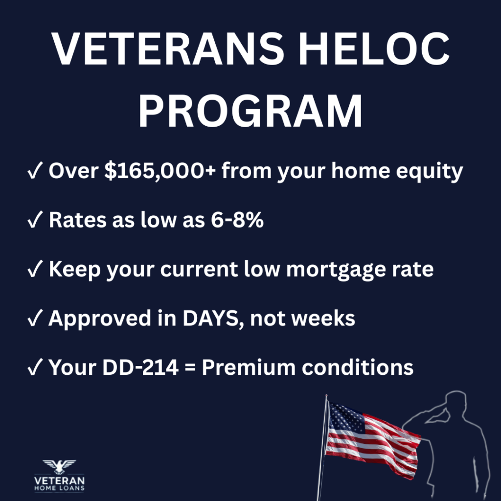 Here's the thing most veterans don't know: There's a special Veterans HELOC Program that can get you access to over $165,000 from your home equity - with exclusive benefits and streamlined processes that recognize your service. You earned this through your time in uniform. While everyone else goes through the standard process, veterans who know about this program are getting preferential treatment.